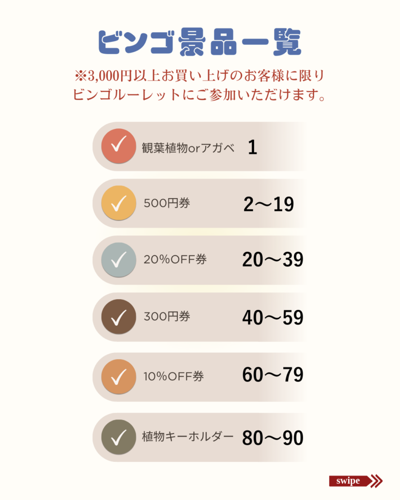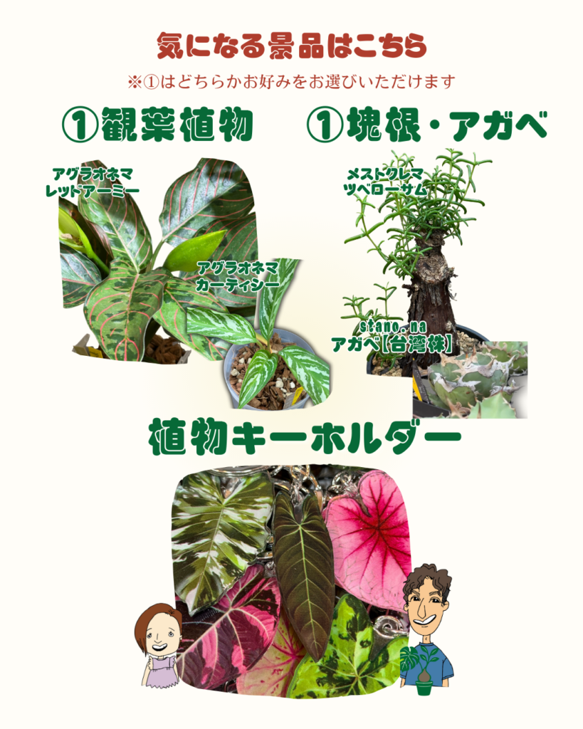 クーポン・金券・キーホルダーに加え、当たりの①番は植物が選べます🌿